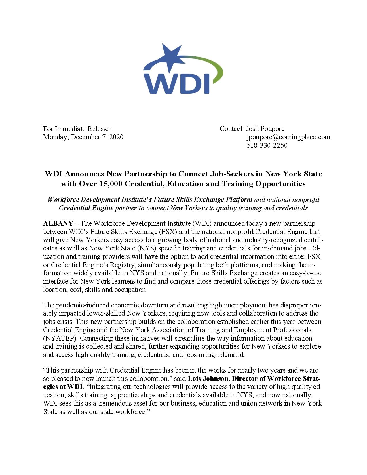 ALBANY – The Workforce Development Institute (WDI) announced today a new partnership between WDI’s Future Skills Exchange (FSX) and the national nonprofit Credential Engine that will give New Yorkers easy access to a growing body of national and industry-recognized certifi- cates as well as New York State (NYS) specific training and credentials for in-demand jobs. Education and training providers will have the option to add credential information into either FSX or Credential Engine’s Registry, simultaneously populating both platforms, and making the information widely available in NYS and nationally. Future Skills Exchange creates an easy-to-use interface for New York learners to find and compare those credential offerings by factors such as location, cost, skills and occupation.
